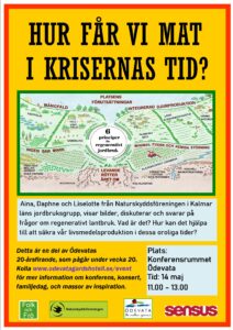 Daphne, Aina och Liselotte från Naturskyddsföreningen i Kalmar län, i samarbete med Folk och Frö samt Sensus, berättar mer på Ödevata Gårdshotell öster om Emmaboda den 14 maj kl. 11-13. Se affischen nedan.