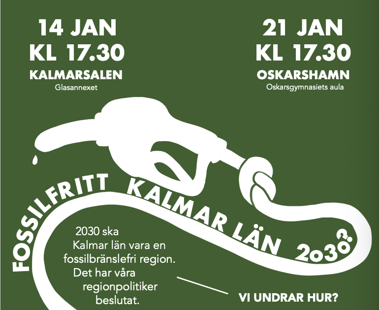 Det finns alltså politiskt beslut (från region Kalmar) på att Kalmar län ska 2030 vara en fossilbränslefri region! FEM år ! HUR ska det gåt till? Det undrar Klimataktion Kalmar län, och ställer regionpolitikerna mot väggen. KALMAR: 14 januari kl. 17.30 i Kalmarsalen/Glasverandan. OSKARSHAMN: 21 januari kl. 17.30 i Oskargymnasiets aula. Du […]